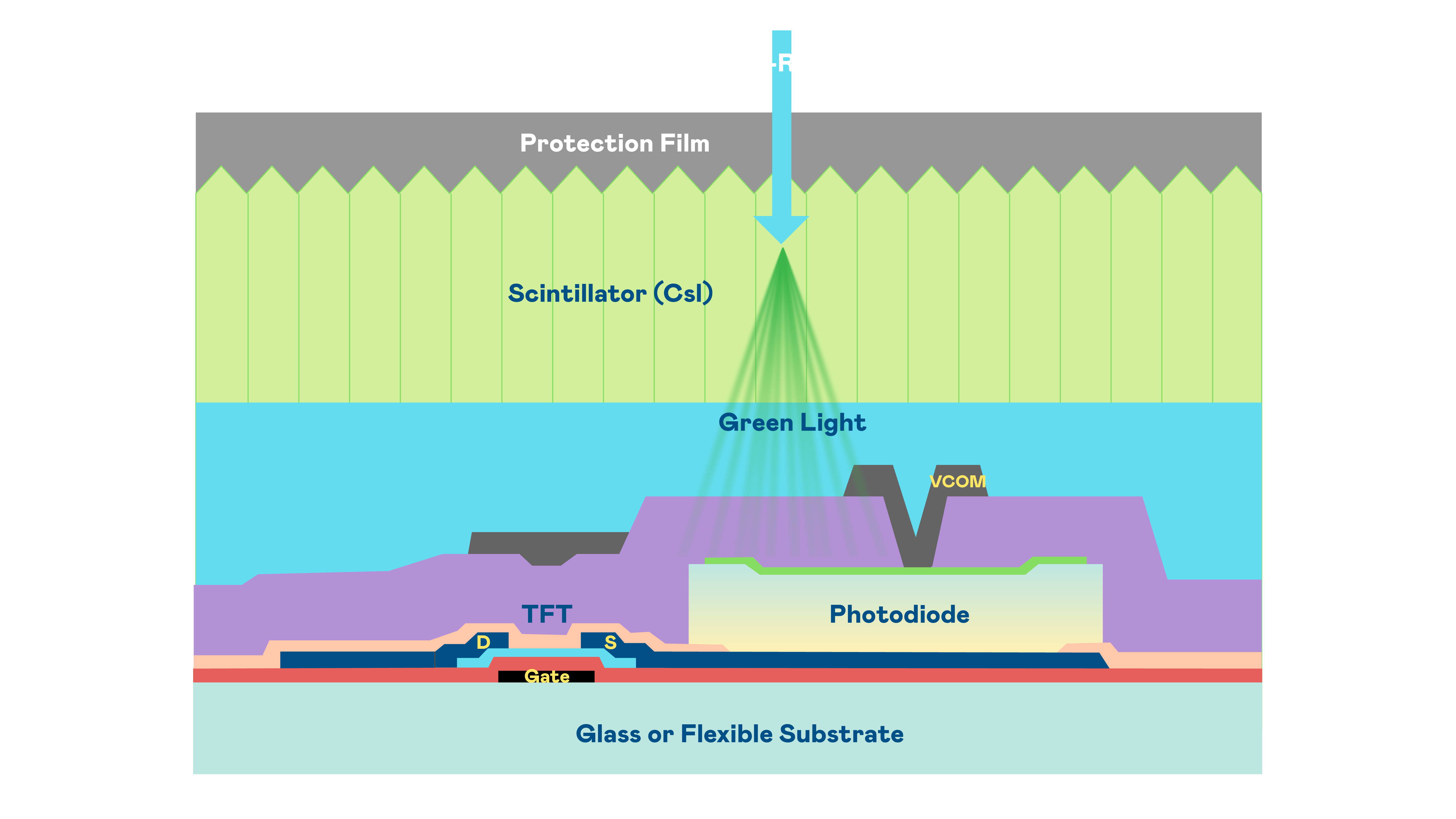 六合联盟的X光影像感測陣列使用薄膜電晶體 (TFT) 作為每個像素的讀取開關,搭配光電二極體(Photodiode)的光電轉換元件,用以感測X光影像訊號。